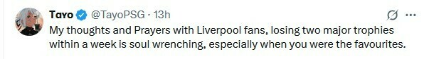 Ꭲɑʏᴏ: Мои мысли и молитвы с болельщиками «Ливерпуля». Потеря двух главных трофеев в течение недели – это душераздирающе, особенно когда вы были фаворитами.
