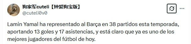 狗家军cuteli【钟爱狗宝版】: Ламин Ямал представлял «Барсу» в 38 матчах в этом сезоне, забив 13 голов и сделав 17 передач, и очевидно, что он уже сегодня является одним из лучших игроков в футболе.