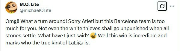 M.O. Lite: Боже!! Какой поворот! Извините, Атлети, но эта команда Барселоны для вас слишком много. Даже белые воры не останутся безнаказанными, когда все сложится. Ну, эта победа невероятна и показывает, кто настоящий король Ла Лиги.