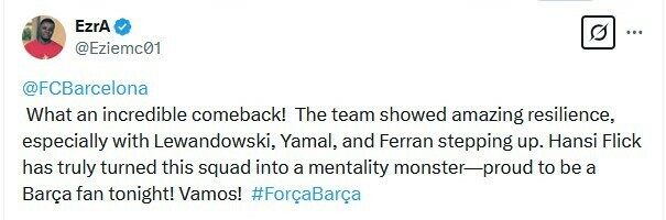 EzrA: Какой невероятный камбэк! Команда продемонстрировала удивительную стойкость, особенно с выходом на поле Левандовски, Ямала и Феррана. Ханси Флик действительно превратил этот состав в ментального монстра – горжусь тем, что сегодня я болею за «Барсу»! Vamos!