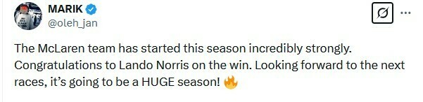 MARIK: Команда McLaren начала этот сезон невероятно сильно. Поздравляем Ландо Норриса с победой. С нетерпением жду следующих гонок, это будет грандиозный сезон!