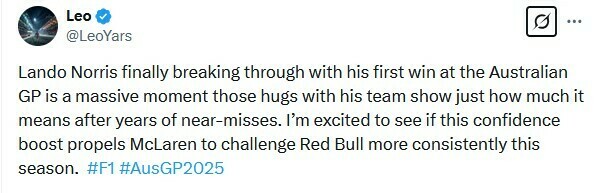 Leo: Ландо Норрис наконец-то прорвался с первой победой на Гран-при Австралии – это знаменательный момент, эти объятия с командой показывают, как много это значит после многих лет неудач. Мне не терпится увидеть, поможет ли эта уверенность McLaren более последовательно бросать вызов Red Bull в этом сезоне.