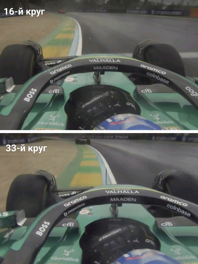После незначительного промаха в 11-м повороте Ферстаппен потерял позицию относительно Пиастри, но главное – его шины начали быстро перегреваться, что привело к значительному отставанию.