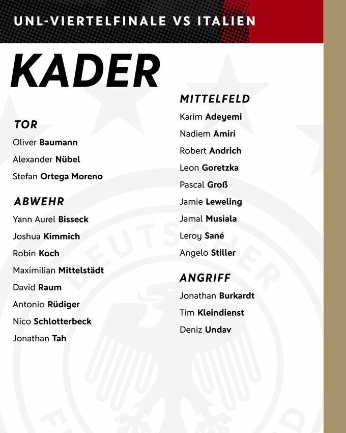 Главный тренер Юлиан Нагельсман объявил заявку команды на матчи Лиги наций.