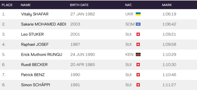 Виталий оправдал ожидания и одержал уверенную победу. Украинец победил со временем 1:06:19 часов. На втором месте молодой сомалийский атлет Сакари Мохамед Абди, который пытался навязать борьбу Шафару, но отстал от него в итоге на 23 секунды (1:06:42). Бронзу, с отрывом в 3 минуты от лидера, завоевал Лео Стукер (Швейцария) - 1:09:21.