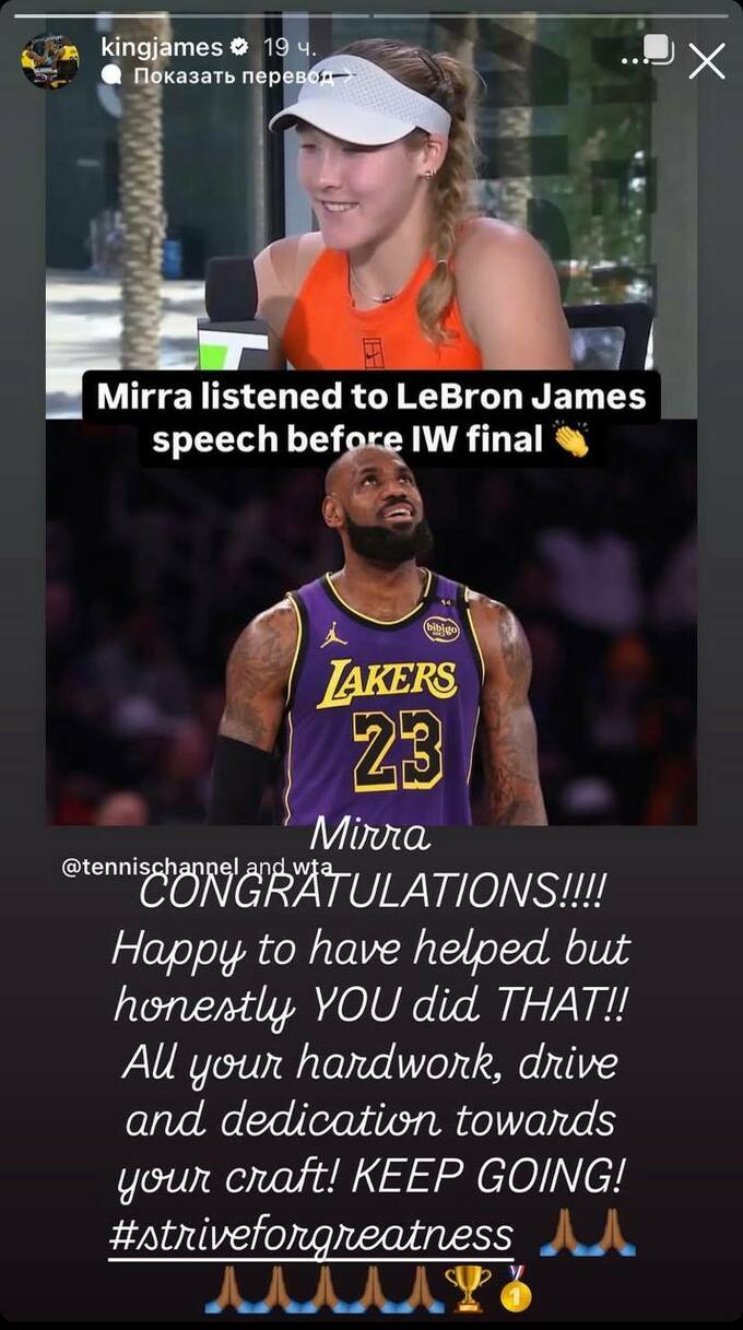 Легендарный баскетболист Леброн Джеймс обратился к представительнице рф Мирре Андреевой, которая торжествовала на престижном турнире WTA в Индиан-Уэллсе