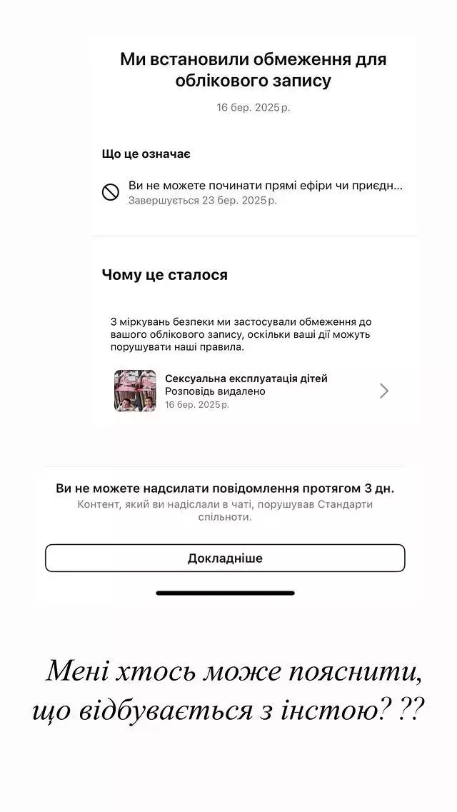 Реакция соцсети оказалась неожиданной – её профиль ограничили на три дня из-за якобы сексуальной эксплуатации детей.