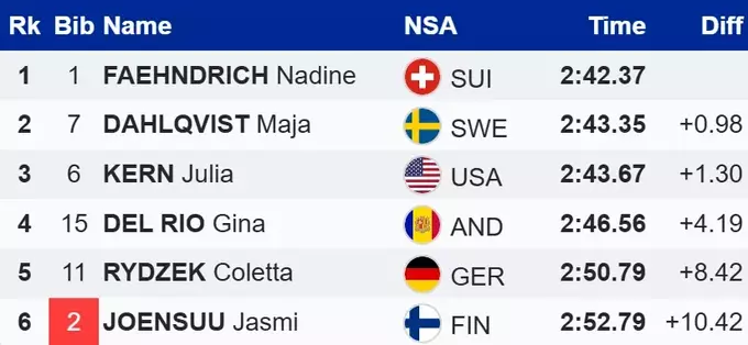 Победу в гонке одержала участница из Швейцарии Надин Фендрих, которая преодолела дистанцию за 2 минуты и 42 секунды. Вторую позицию заняла проигравшая 0.98 секунды шведка Майя Дальквист. Третьей стала американка Джулия Керн.
