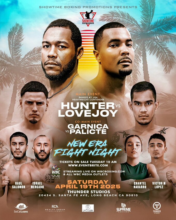 19 апреля на арене «Thunder Studios» в Лонг-Бич (США) состоится вечер бокса, организованный промоутерской компанией Showtime Boxing Promotions.