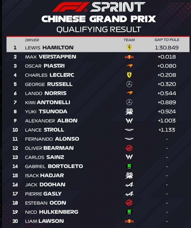 В рамках гран-при Формулы-1 в Китае состоялась первая спринтерская квалификация нынешнего сезона. Поул довольно неожиданно завоевал пилот Феррари Льюис Хэмилтон.