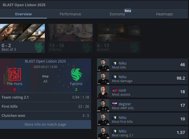 Саудовский клуб Falcons одолел монгольскую команду The Huns со счетом 2:0 в нижней сетке турнира BLAST Open Lisbon 2025, оставаясь в борьбе за выход в следующий этап.