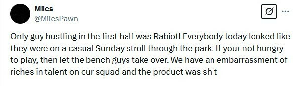 Miles: Единственный парень, который суетился в первой половине, был Рабьо! Сегодня все выглядели так, будто они были на обычной воскресной прогулке в парке. Если вы не хотите играть, то пусть ребята на скамейке запасных займутся этим. В нашей команде слишком много талантов, а продукт был дерьмовым.