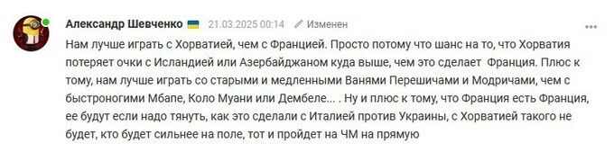 Александр Шевченко: Нам лучше играть с Хорватией, чем с Францией. Просто потому что шанс на то, что Хорватия потеряет очки с Исландией или Азербайджаном куда выше, чем это сделает Франция. Плюс к тому, нам лучше играть со старыми и медленными Ванями Перешичами и Модричами, чем с быстроногими Мбапе, Коло Муани или Дембеле... . Ну и плюс к тому, что Франция есть Франция, ее будут если надо тянуть, как это сделали с Италией против Украины, с Хорватией такого не будет, кто будет сильнее на поле, тот и пройдет на ЧМ на прямую.