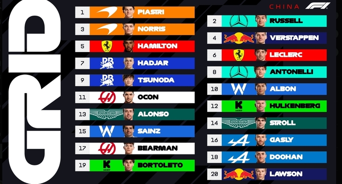 Состоялась квалификация в рамках гран-при Формулы-1 в Китае. Поул завоевал пилот Макларена Оскар Пиастри, который опередил Джорджа Расселла на Мерседесе и напарника Ландо Норриса.