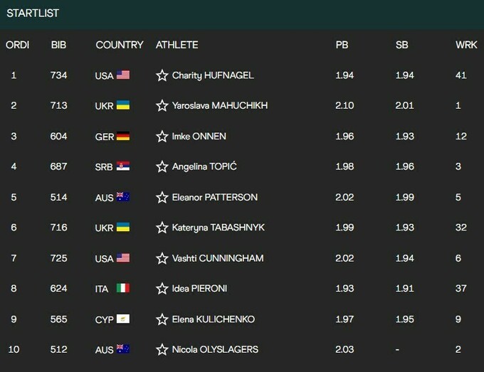 ЧМ-2025 по легкой атлетике. Прыжки в высоту (женщины). Стартовый лист