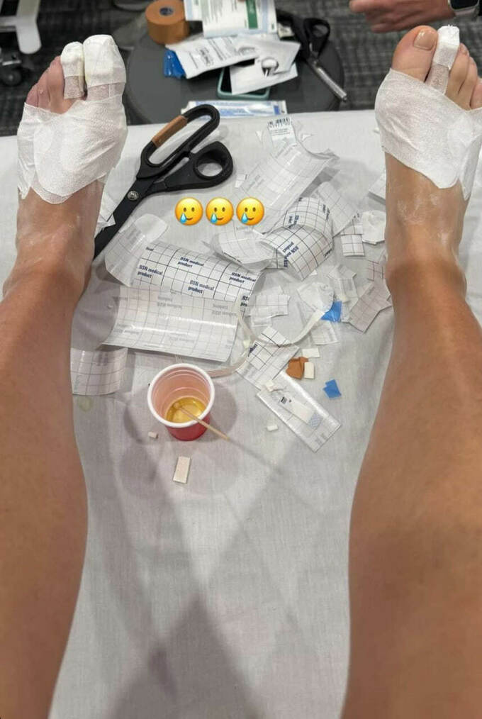 У Русе, скорее всего, ряд проблем: физио разминала теннисистке и левую, и правую ногу. А после матча Русе опубликовала сториз в своем Instagram, где видно забинтованные пальцы. Предположительно, из-за волдырей.