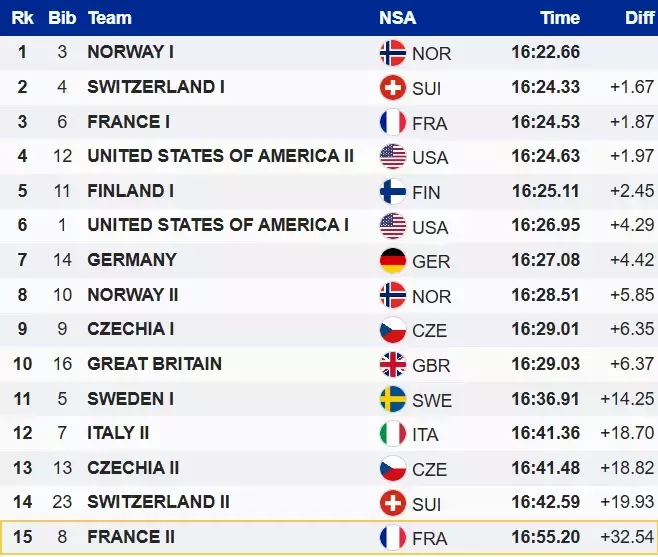 Первыми финишировала сборная Норвегии, от которой выступали Йоханнес Клэбо и Эвен Нортуг. За ними расположились швейцарские спортсмены Яник Рибли и Валерио Гронд, уступившие в 1.67 секунды. На третьем месте остановились французы Ришар Жув и Лука Шанава.