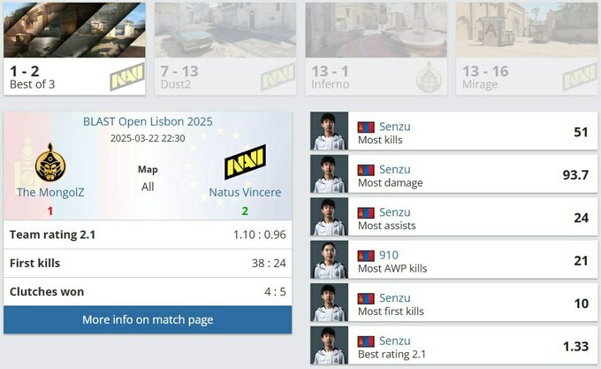 Natus Vincere гарантировали себе место в плей-офф BLAST Open Lisbon, победив The MongolZ в напряжённом решающем матче на Mirage в рамках полуфинала верхней сетки группы B
