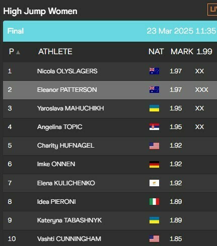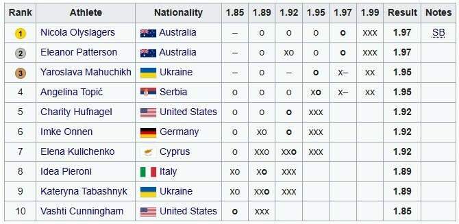 Две австралийских спортсменки Никола Олислагерс и Элеанор Паттерсон взяли высоту 1.97 метра и заняли первое и второе места соответственно.