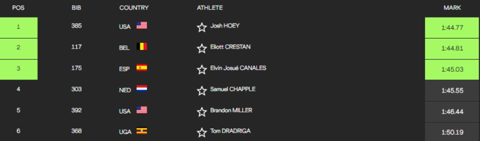 У мужчин во время преодоления дистанции была ожесточенная борьба между американцем Джошем Гоуи и бельгийцем Элиоттом Крестаном. Было не понятно, кто из них победит. Судьба победителя решилась на финишной прямой. Им стал Гоуи со временем 1:44.77 мин, Крестан отстал лишь на 0.04 (1:44.81). Бронзу взял 23-летний испанец Элвин Хосуэ Каналес – 1:45.03 мин.
