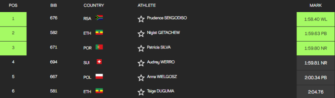 Также у женщин были установлены национальные рекорды. Рекорд Португалии теперь принадлежит Патриции Сильве – 1:59.80, а Швейцарии – Одри Верро (1:59.81).