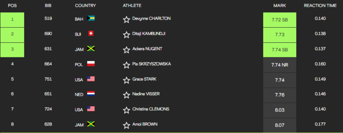 Кто займет третье место решал фотофиниш. И у Акеры Ньюджент (Ямайка), и у Пии Скшишовской (Польша) был одинаковый результат 7.74 секунд. По решению судей бронза была присуждена ямайской легкоатлетке.