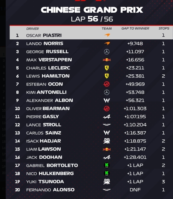 Состоялась гонка в рамках гран-при Формулы-1 в Китае. Победу одержал пилот Макларена Оскар Пиастри, который стартовал с поула и провел безошибочный заезд, выиграв третий раз в карьере Ф-1.