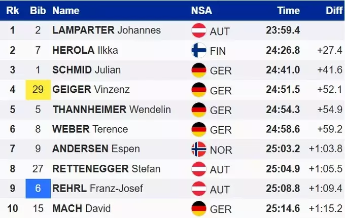 Вторую победу в сезоне оформил представитель Австрии Йоханнес Лампартер, завершивший соревнование по общему времени 23:59.4. За ним расположился Илкка Херола, которому удалось обрадовать местную публику. Для триумфа финну не хватило 27.4 секунды. На третьей позиции оказался Винценц Гайгер из Германии.