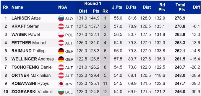 Представитель Словении Анже Ланишек впервые в текущем сезоне победил на уровне Кубка мира. Спортсмен в итоге получил от судей 276.9 балла. Вторую позицию занял Штефан Крафт, боровшийся за триумф, но уступивший в 6.1 очка. Третий – Павел Вонсек, который впервые оказался на подиуме Кубка мира.