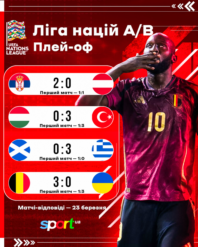- 21:45. Бельгия – Украина – 3:0 (первый матч – 1:3)