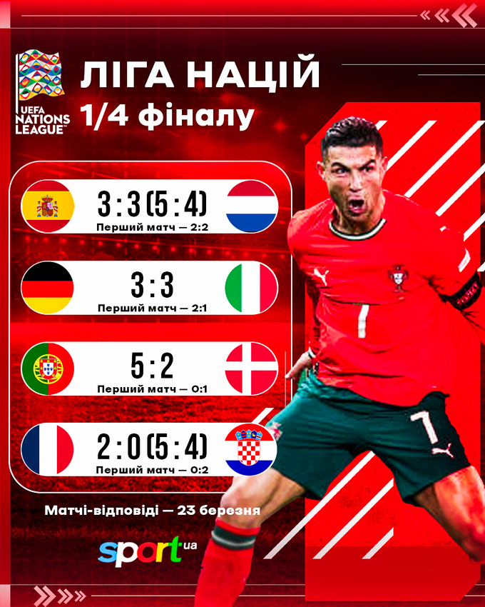 Вечером 23 марта состоялись ответные матчи 1/4 финала Лиги наций 2024/25.