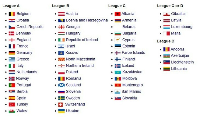 Лига A. Бельгия, Хорватия, Чехия, Дания, Англия, Франция, Германия, Греция, Италия, Нидерланды, Норвегия, Португалия, Сербия, Испания, Турция, Уэльс