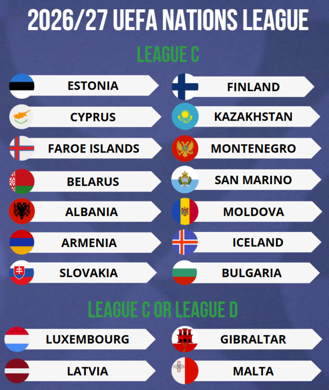 Лига C. Албания, Армения, беларусь, Болгария, Кипр, Эстония, Фарерские острова, Финляндия, Исландия, Казахстан, Молдова, Черногория, Сан-Марино, Словакия