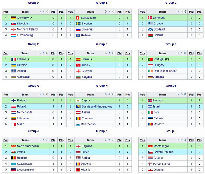 Команды, отмеченные буквой X, гарантированно попадут, как минимум, в плей-офф квалификации ЧМ благодаря успешному выступлению в Лиге наций.