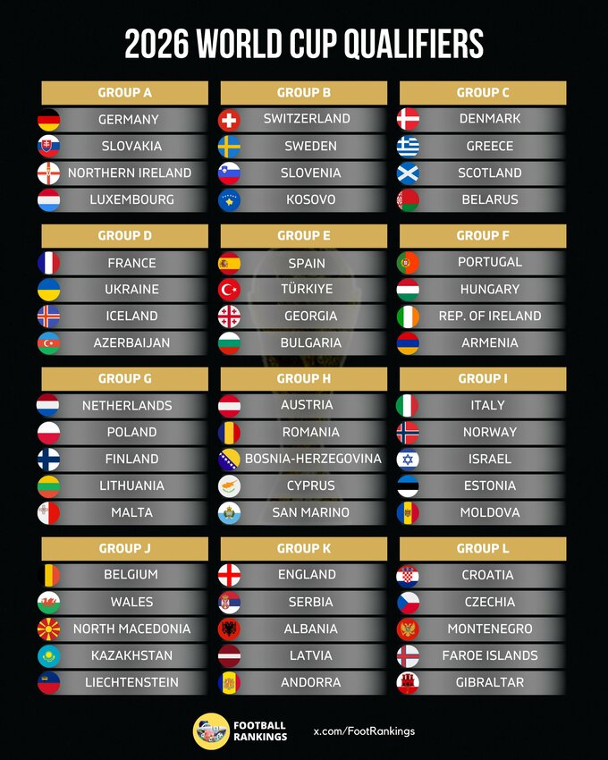 По итогам четвертьфиналов Лиги наций определены состав всех групп в отборе на чемпионат мира 2026 в зоне УЕФА.