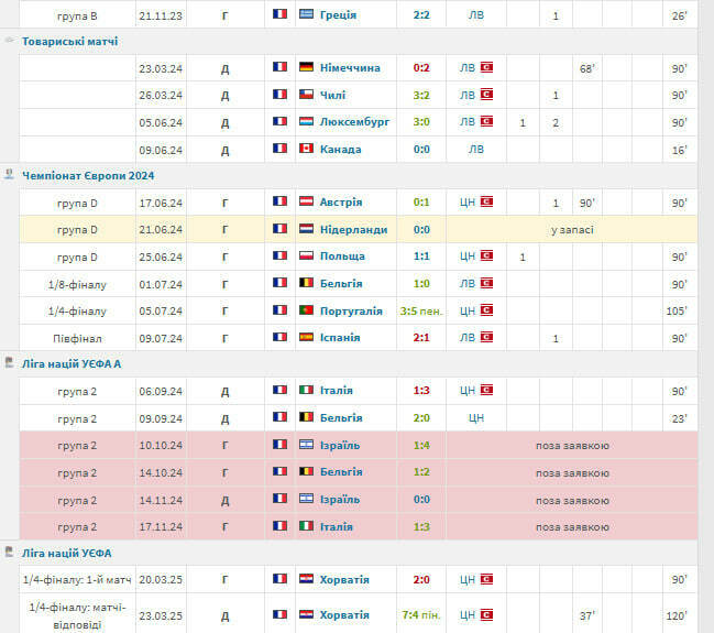 Единственные два гола Мбаппе забил в матчах против Люксембурга (5 июня 2024 года) и Польши (25 июня 2024 года, с пенальти).