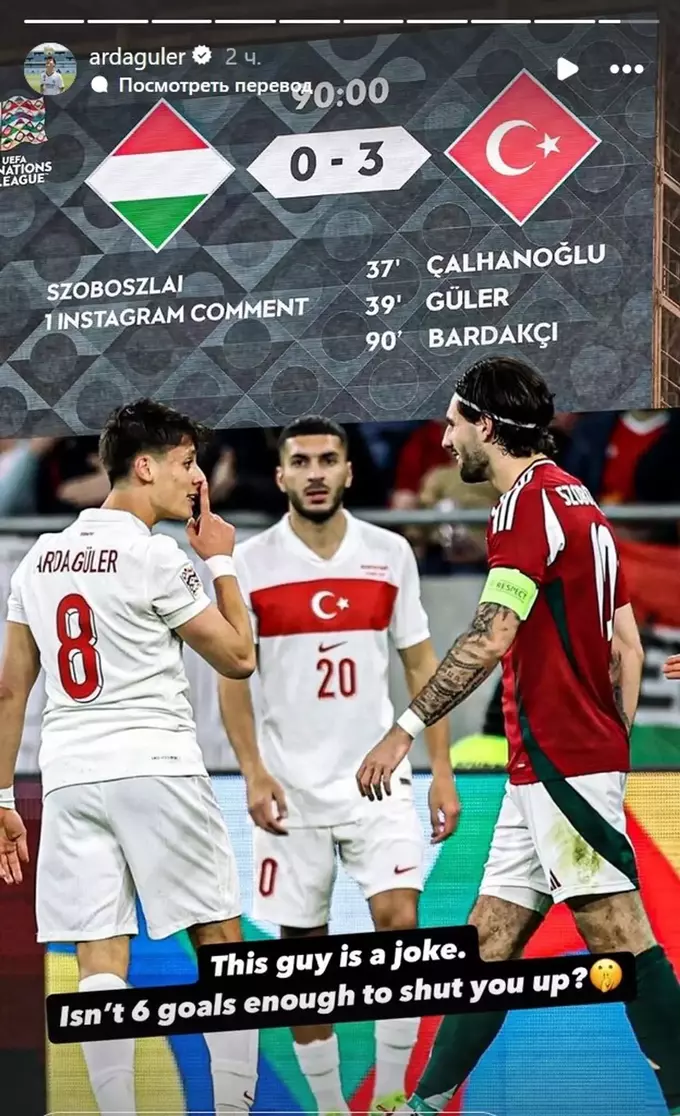 На 39-й минуте матча игрок сборной Турции Арда Гюлер забил гол в ворота венгров. Во время празднования он подошел к Доминику Собослаи и поднял указательный палец к губам, прося венгра вести себя тише.