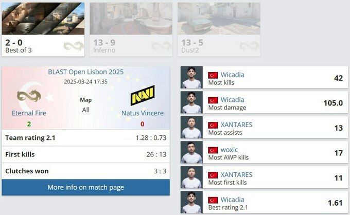 Это первая победа Eternal Fire над NAVI после пяти поражений подряд, и она стала настоящей демонстрацией силы. Турки доминировали на Inferno и Dust2, благодаря отличной игре Али «Wicadia» Хайдара Ялчина и Исмаилджана «XANTARES» Дёрткардеша.