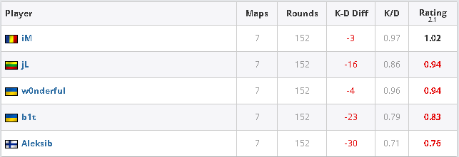 Худшая ситуация у капитана команды Алекси «Aleksib» Виролайнена – всего 0.76 рейтинга и -30 по разнице убийств и смертей. Немного лучше результаты у Валерия «b1t» Ваховского (0.83) и Юстинаса «jL» Лекавичюса (0.94), хотя они и были ключевыми игроками в победных матчах.