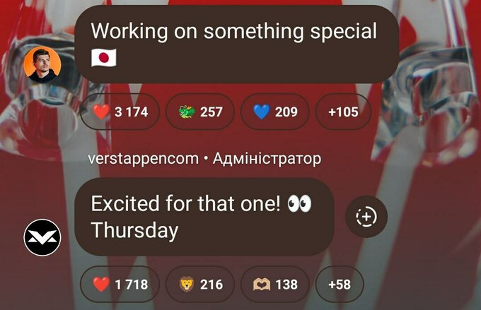 На своем Instagram-канале «Verstappen.com» Макс Ферстаппен в понедельник утром опубликовал загадочное сообщение: «Работаю над чем-то особенным», сопровождаемое японским флагом. Учётная запись Verstappen.com подтвердила, что объявление состоится в этот четверг, отметив, что они «в восторге» от предстоящего события.