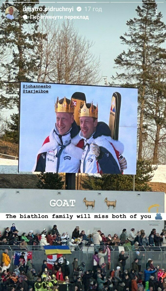Лидер сборной Украины по биатлону Дмитрий Пидручный в социальной сети Instagram поблагодарил норвежцев Тарьей и Йоханнеса Бё за большой вклад в биатлон. Братья завершили профессиональную карьеру после последнего старта сезона в Холменколлене.