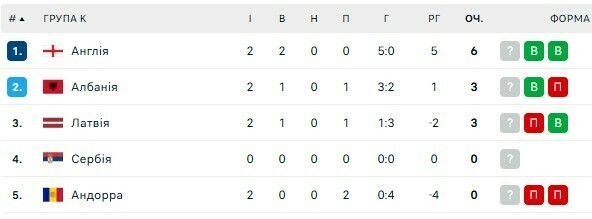В другом матче группы K Албании переиграла команду Андорры (3:0).