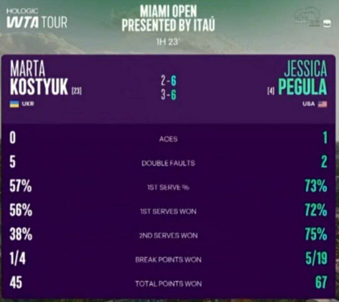 Украинская теннисистка Марта Костюк (WTA 29) завершила выступления на хардовом турнире WTA 1000 в Майами, США.