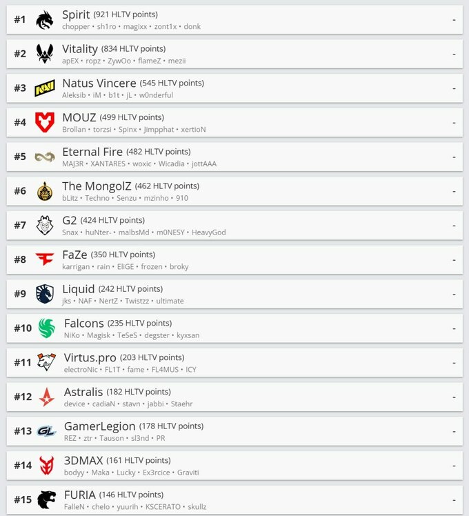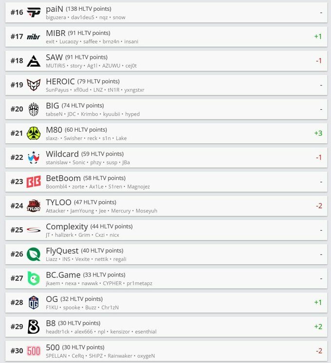Единственное изменение в топ-10 произошло между G2 и FaZe. G2 поднялись на одну строчку и теперь занимают седьмое место с 424 очками. В свою очередь, FaZe (350 очков) потеряли одну позицию и теперь находятся на восьмом месте. Десятку лучших закрывают Liquid (242 очка) и Falcons (235 очков), которые остались на своих местах.