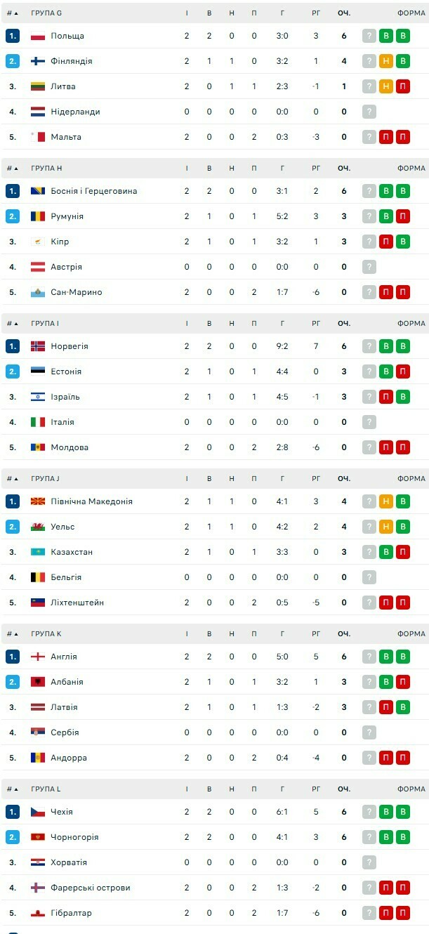 Турнирные таблицы квалификации ЧМ-2026. Холанд на высоте, разгром от Чехии