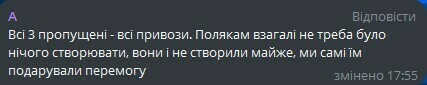 A: Все 3 пропущенные – все привозы. Полякам вообще не нужно было ничего создавать, они и не создали почти, мы сами им подарили победу.