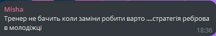 Misha: Тренер не видит когда замены делать стоит….стратегия Реброва в молодежке.