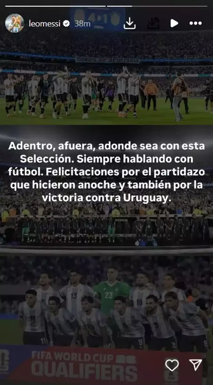 «На поле или вне его, где бы это ни происходило, сборная Аргентины всегда говорит через футбол. Поздравляю со вчерашним результатом, а также с победой против команды Уругвая», – написал Месси в Инстаграме.