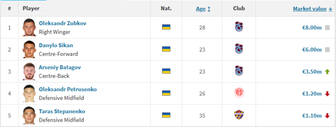 - Даниил Сикан (Трабзонспор) – 6 млн евро (без изменений)