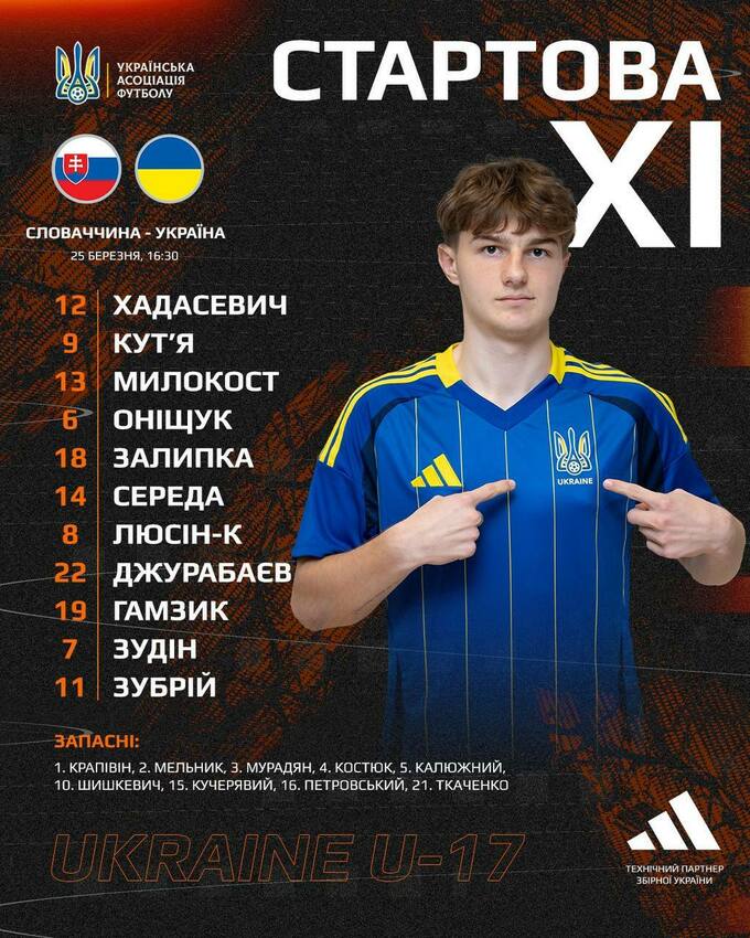 Украина U-17: Хадасевич, Кутья, Милокост, Онищук, Залипка, Середа (А. Ткаченко, 75), Люсин, Джурабаев (Петровский, 90+4), Гамзик (Мурадян, 66), Зудин (Калюжный, 90+4), Зубрий (Кучерявый, 66).